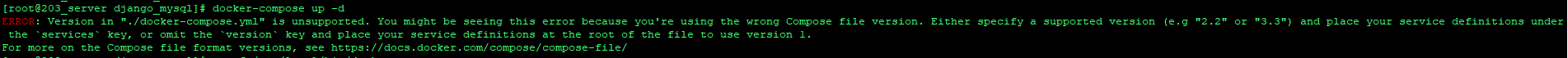 ERROR: Version in "./docker-compose.yml" is unsupported. You might be seeing this error because you're using the wrong Compose file version. Either specify a supported version (e.g "2.2" or "3.3") and place your service definitions under the `services` key, or omit the `version` key and place your service definitions at the root of the file to use version 1.