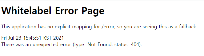 컨트롤러 설정을 안해줬으니 아래처럼 에러페이지가 뜨는건 당연합니다.