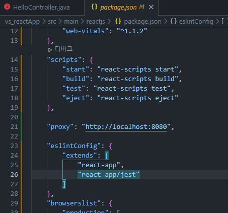 java/com/example/vs_reactApp 경로 안에 HelloController.java 파일을 만들고 아래 처럼 내용을 입력해주고