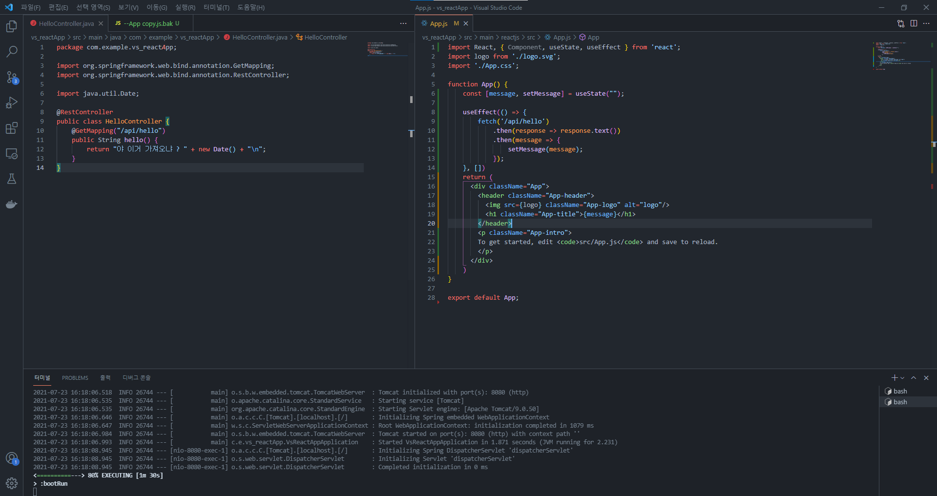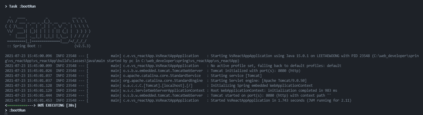 리액트 설정은 이쯤하고 스프링부트에서도 gradle build 와 run 이 잘되는지를 확인해야되서 터미널창을 하나 더 열고,