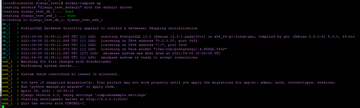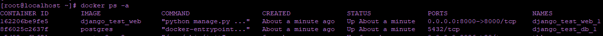 아래처럼 django 컨테이너와 코끼리db 컨테이너가 구동되고있음을 확인할수 있다.