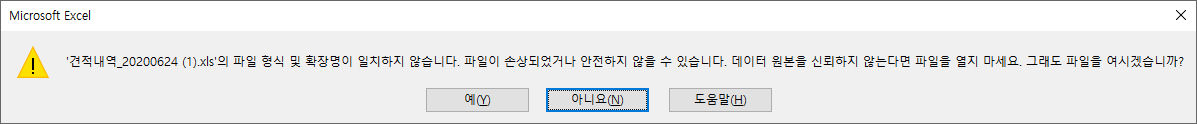 xls 의 파일 형식 및 확장명이 일치하지 않습니다. 파일이 손상되었거나 안전하지 않을 수 있습니다. 데이터 원본을 신뢰하지 않는다면 파일을 열지 마세요. 그래도 파일을 여시겠습니까?