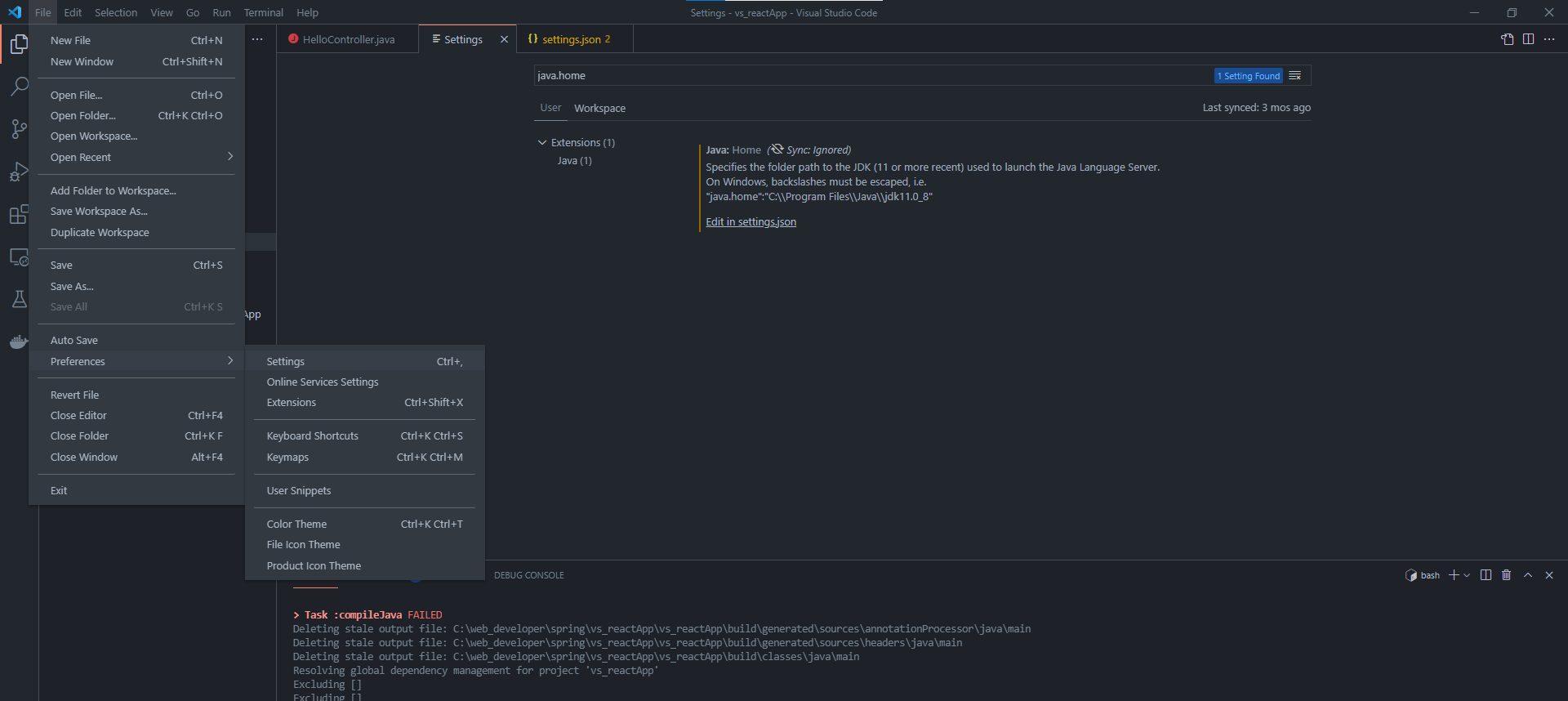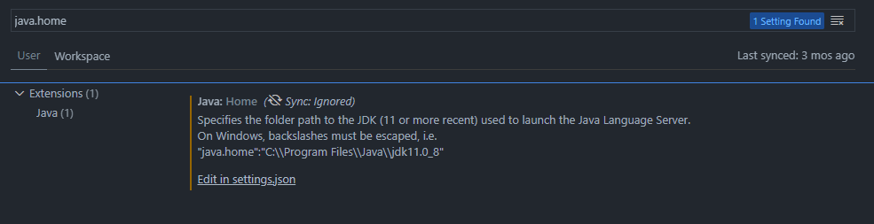 java.home 이라고 치면 아래처럼 뜨는데 저기서 Edit in settings.json 을 눌러서 경로 수정만 해주면된다.